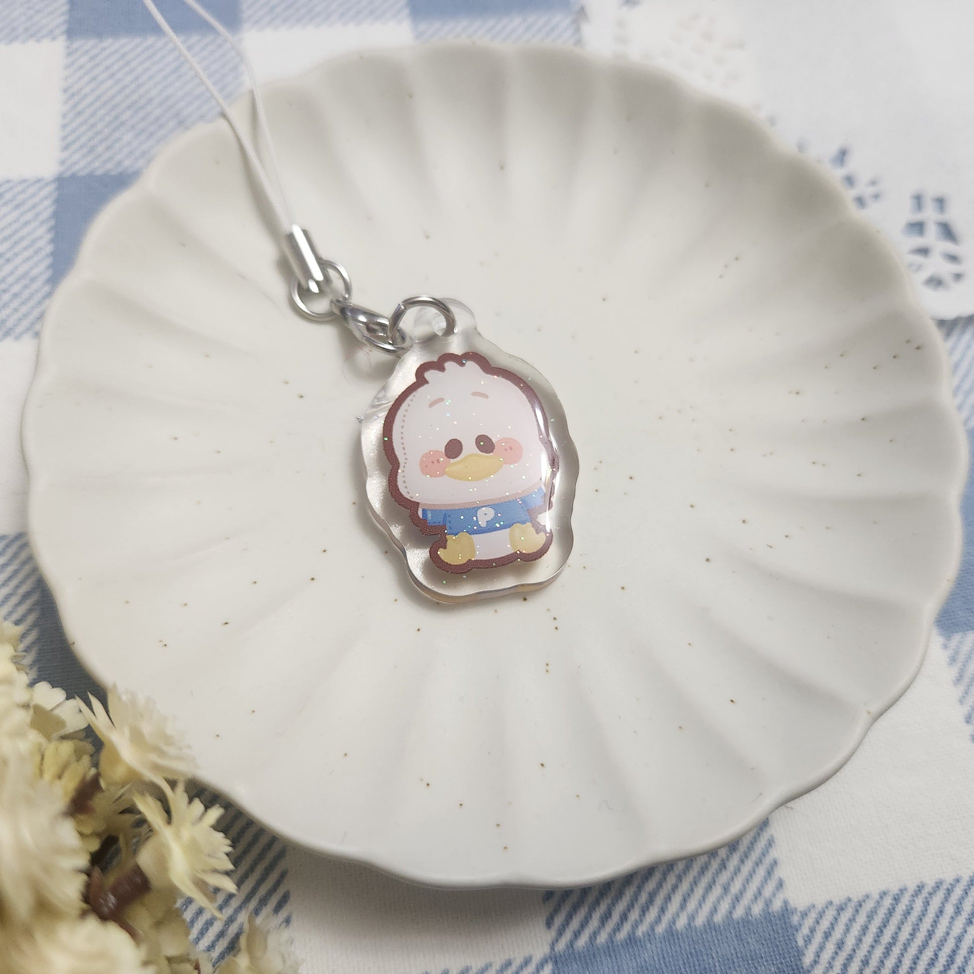 ❀ Clear acrylic with front side epoxy glitter finish, with phone strap